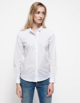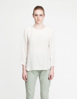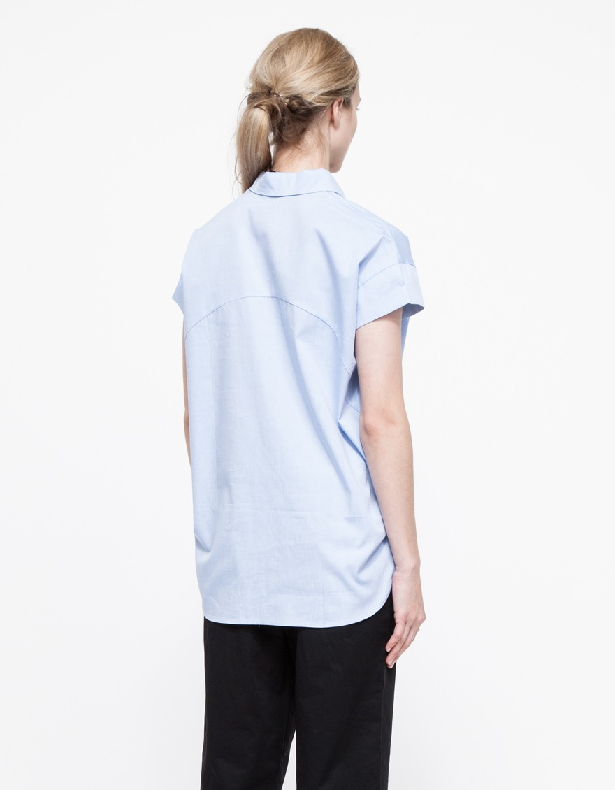 From Stelen, a button front blouse with a geometric cut hemline. Features a rounded front hem, a longer back hem, cuffed sleeves, and a pointed collar with a relaxed, boxy fit.